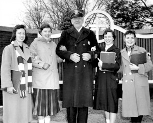 Martha Ann Jacob, in a 1956 newspaper article, wrote about Tiny Tim: “Each night since 1916 Mr. O’Dwyer, as a member of the Terre Haute city police force, has patrolled Saint Mary-of-the-Woods College grounds. He wears the city police badge on the chest of his blue uniform and on his sleeve are the gold stripes signifying forty years of service.
