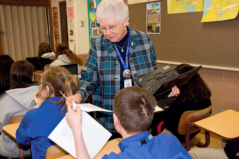 “After 17 and three-quarter years of teaching at Guerin, friends will often suggest that I know it all by now and teaching should be a breeze,” said Sister Kay, who teaches freshman and sophomore theology. “But about five years ago, Guerin Prep introduced one-to-one computing for students, providing each student with a computer laptop. Many of my current colleagues grew up with a laptop on their highchair. Others were quick to learn the ins and outs of computer use. I admit I’m the tortoise at being proficient with a computer.