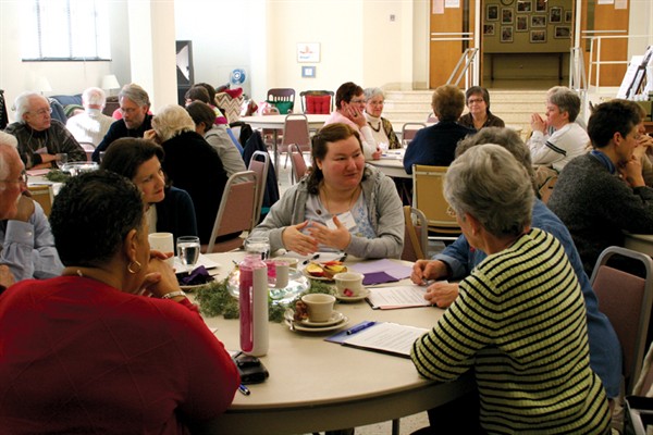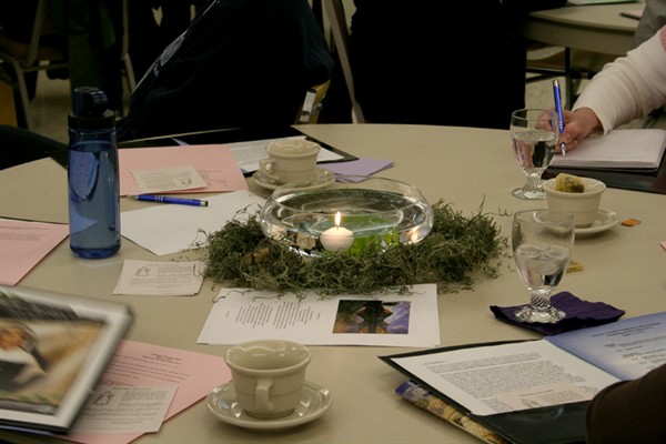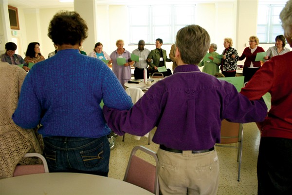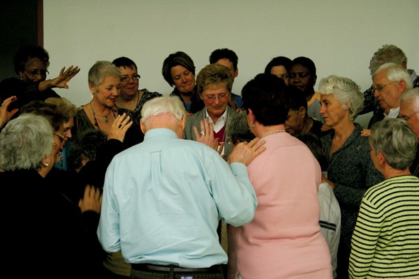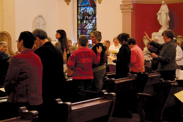 Orientation: Sister Barbara Battista places her hand in blessing on the shoulder of Tracy Wilson, Clinton, Ind., during the second orientation for 2011-2012 Providence Candidate-Associates on Saturday, Oct. 29, 2011, at the Woods.