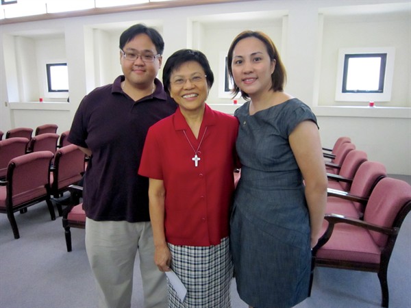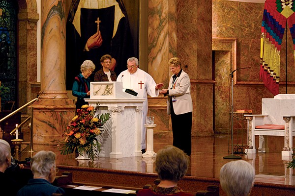 Commitment: During the Eucharistic Liturgy on Saturday, Oct. 29, 2011, Mary Kay Powell (far left) of North Judson, Ind., made her first commitment as an associate. Above, Father Daniel Hopcus blesses the associate pin that Sister Diane Mason (right) is holding in her hand. Looking on next to Mary Kay is Sister Dawn Tomaszewski, general officer liaison to the associates. Father Dan is also a Providence Associate.