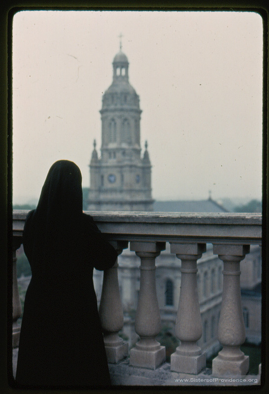A Sister of Providence looking out toward the Church of the Immaculate Conception at Saint Mary-of-the-Woods, Indiana.