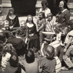 The 44 postulants in the reception band (class) of 1961 gathered in the Owens Auditorium as “Brides of Christ” prior to their being received into the novitiate at a Eucharistic Liturgy in the Church of the Immaculate Conception. Prior to 1964, young women who were entering the novitiate dressed in wedding dresses and received the holy habit during the liturgy of entrance.