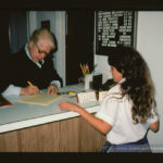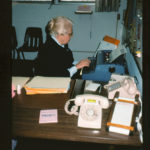 Retired Sister Claudia Lewis ministers as receptionist and phone operator in Providence Hall (1987).