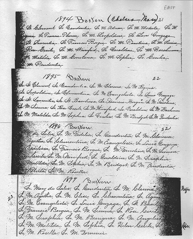 This record from the Sisters of Providence Archives shows Sisters assigned to minister in Boston in the years 1894, 1895, 1896 and 1897.