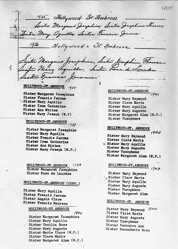 The Obedience lists for St. Ambrose School in Hollywood, Calif., from 1935-1944.