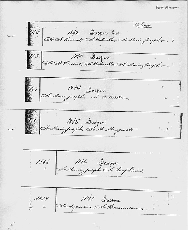 These records show the sisters assigned to the very first mission the Sisters of Providence accepted in Jasper, Indiana.