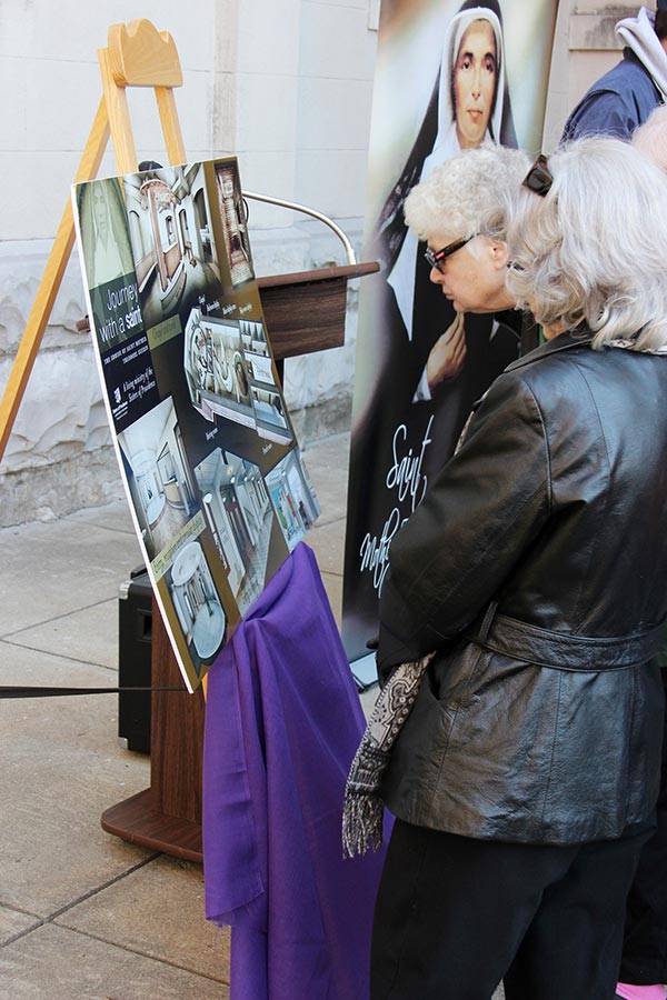 Shrine plans view: Those gathered for a construction blessing as work gets underway for a new shrine for Saint Mother Theodore Guerin at Saint Mary-of-the-Woods stop to look at the shrine plans which will include museum-like exhibits and memorializes the spiritual and historic journey of Saint Mother Theodore’s life. Download high-resolution photo here: https://spsmw.org/?attachment_id=33569