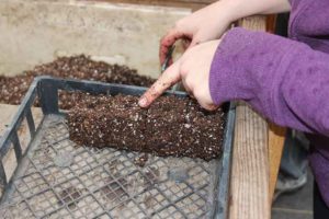 Earlier in the growing season, handheld soil blocker tools are used while planting in the greenhouse. Potting mix is compacted into the soil blockers to create cubes of soil. The filled soil block maker is set into a tray before squeezing and releasing the cubes. There are small depressions in the tops of the soil blocks for seeds. About 90 percent of the vegetables and flowers grown at White Violet Center are planted with soil blockers.