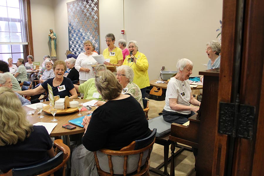 Providence Associate Donna Watzke, at left, joins the crowd in a sing-along led by Joan Townsend, Mary Carroll Blocher and Sheila Donis with Sister Joan Matthews on piano.