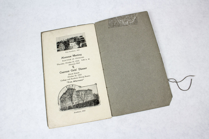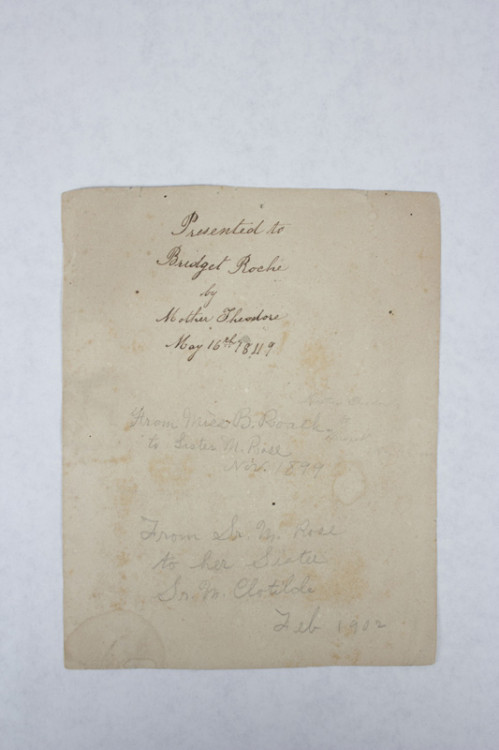 “This album was brought to St. Rose among the souvenirs for our local centenary last October. It was brought by Miss Clementine Weisert, sister of Lizzie Weisert to whom the book belonged. We feel that it will be welcome at St. Mary’s because it was sketched there and because it represents scenes there.” -Undated note from Saint Rose Academy, Vincennes, Indiana