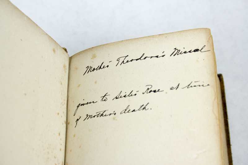 One says, “This crucifix was carefully kept with envelopes and packets containing what may be first class relics of Mother Theodore. It is probable that is associated in some way with Mother Theodore.”