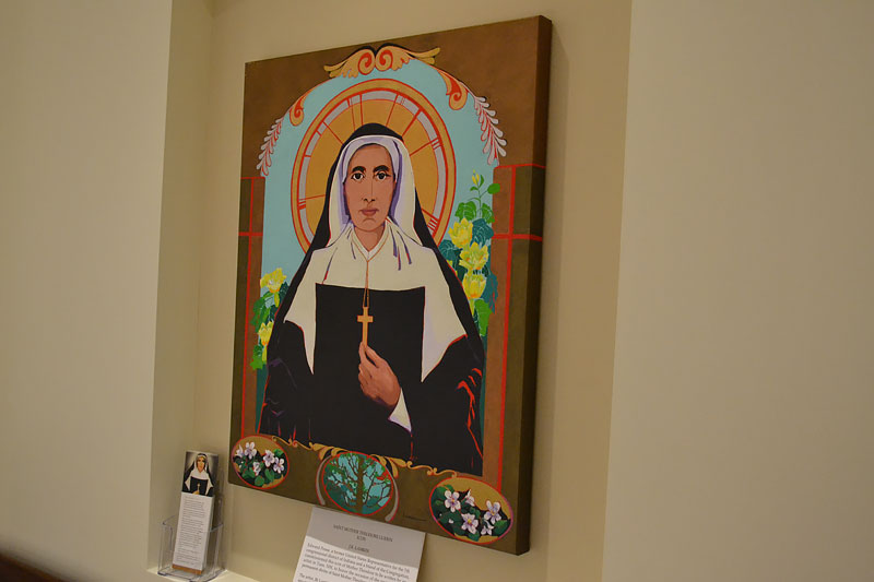 The image became an instant favorite for some sisters and staff members. The brightness of color, Mother Theodore’s beautiful countenance and penetrating eyes readily take the viewer in. The inclusion of familiar symbols like tulip tree blossoms, white violets and fleur-de- lis only add to the pleasure of viewing it. One just naturally wants to “spend some time with it.”
