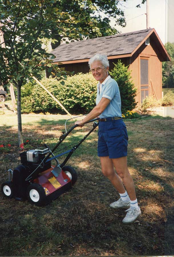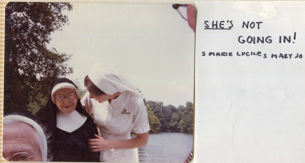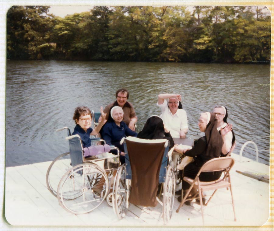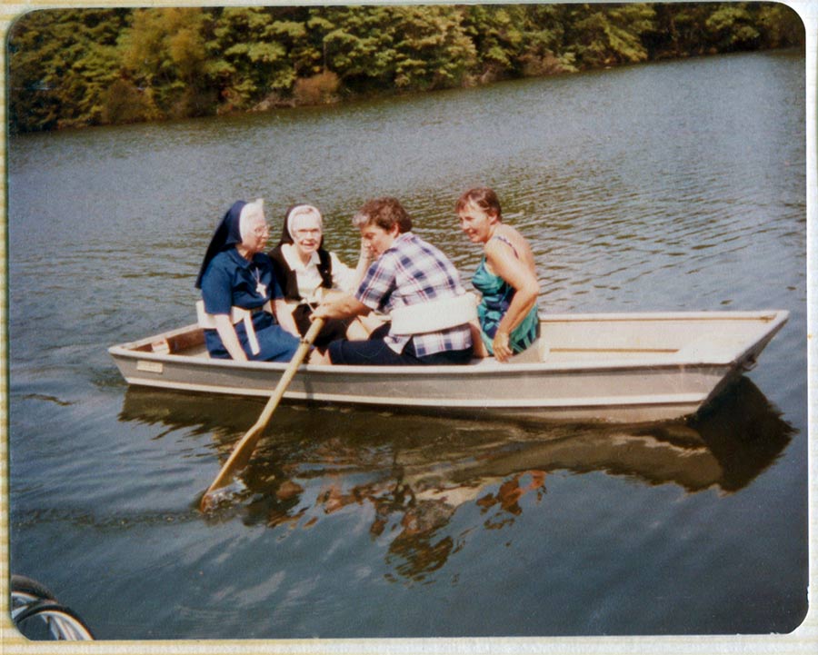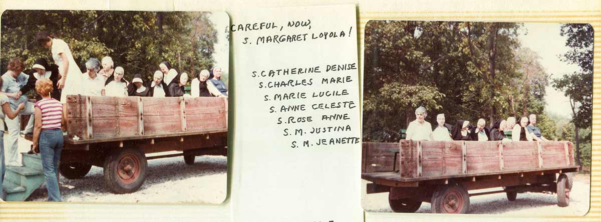 The label on this photo on the scrapbook album: HATS OFF TO THE CREW This handsome crew spent a hot August 15, 1981 seeding the slopes after the enlargement project. Seated on the hay: Jeanne Knoerle, Ruth Eileen Dwyer. Standing left to right: Bernice Kuper, Leona Walsh, Carol Nolan, Jean Fuqua, grandson of Taylor Ramsey, Taylor and Pete Farmer. In the truck: Mary Stella Morrisey, Agnese Boddington, Emily Walsh, Kathleen Desautels, Jean Karier, Sue Pietrus, Carol Meyers.