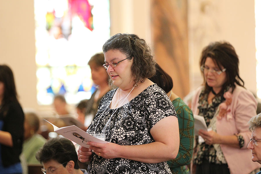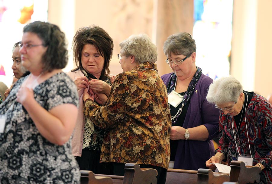 New Providence Associate Sabrina Falls laughs while receiving her Providence Associate pin from her companion Sister Paula Modaff. To the right, Kim Knoblock receives her pin from Sister Dawn Tomaszewski.