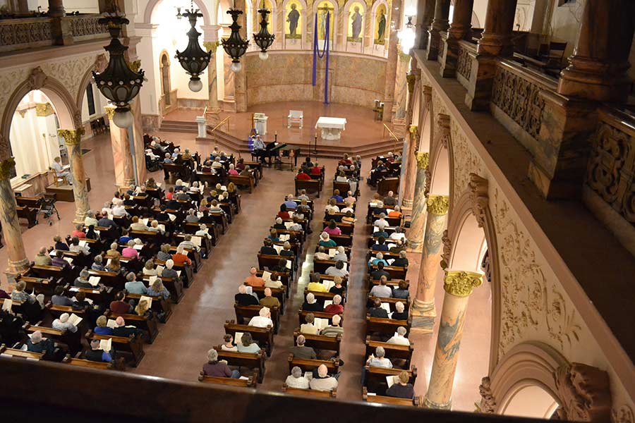The retreat began Friday night with liturgical music composer David Haas sharing his gifts of worship music, singing, piano and guitar playing, and reflections on spiritual practices with a full house at the Church of the Immaculate Conception. He invited us all to join him in singing, praying, and even in-place dancing! Many of us marveled at his ability to keep up two spirited, high energy hours in light of his age and health history — which includes recent open heart surgery!