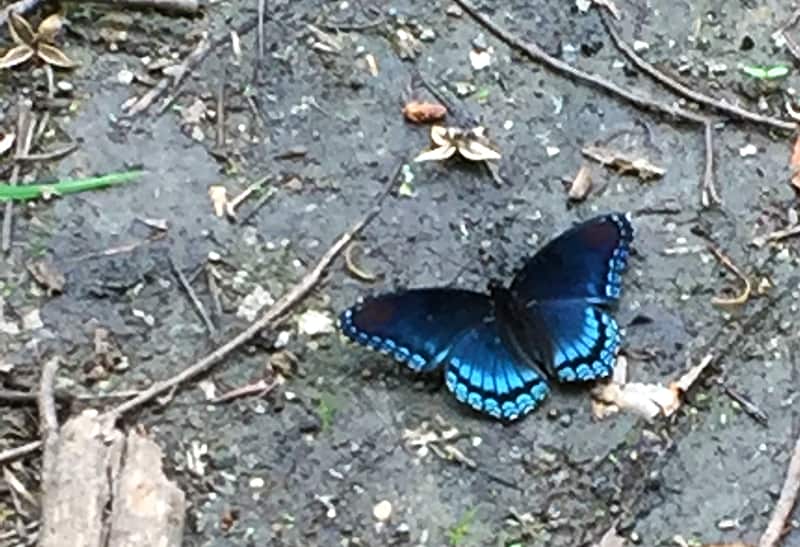 This blue butterfly flitters around the ground, pausing occasionally to show off her colors as she opens and closes her wings. Another blessing.