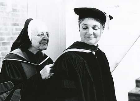 The first photo we have here is of Sister Rosemary receiving assistance in adjusting her Ph.D. robe and hood prior to a SMWC commencement from Sister Mary Joseph Pomeroy (RIP). The photo was taken in 1985 – by Sister Dawn Tomaszewski – after Sister Rosemary had graduated from Vanderbilt.
