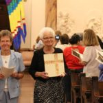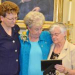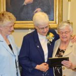 General Officer Sister Jenny Howard (left) watches as General Superior Sister Denise Wilkinson (right) reads a Jubilarian proclamation for Sister Mary Jo Piccione.