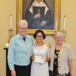 Sister My Huong Pham, celebrating 25 years as a sister, center, with Sister Anne Therese Falkenstein, right, pose with the rice artwork of Saint Mother Theodore Guerin at left, a gift from Sister My Huong’s family on the occasion of her jubilee.