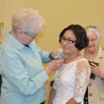 General Officer Sister Lisa Stallings (left) pins a corsage on Sister My Huong Pham as General Superior Sister Denise Wilkinson looks on.