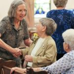 Golden Jubilarian Sister Linda Thompson greets an elder sister.