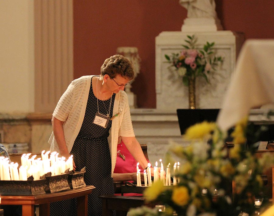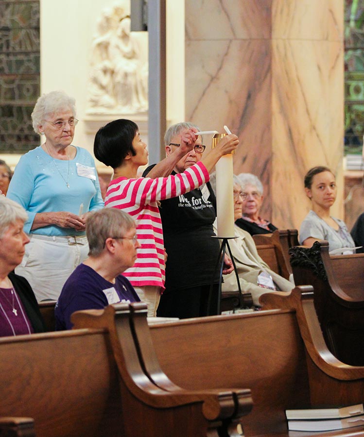 Sister Marian Brady places her candle as a chapter delegate during the opening ritual. (photo by Amy Miranda)