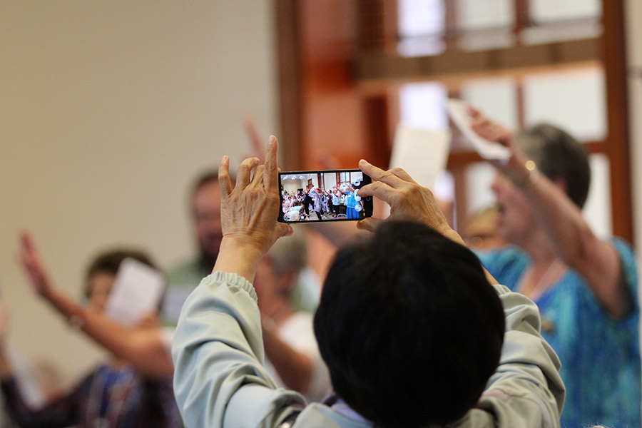 Sister Editha Ben captures a video of the Providence Associates’ song and dance during the social supper. (photo by Amy Miranda)