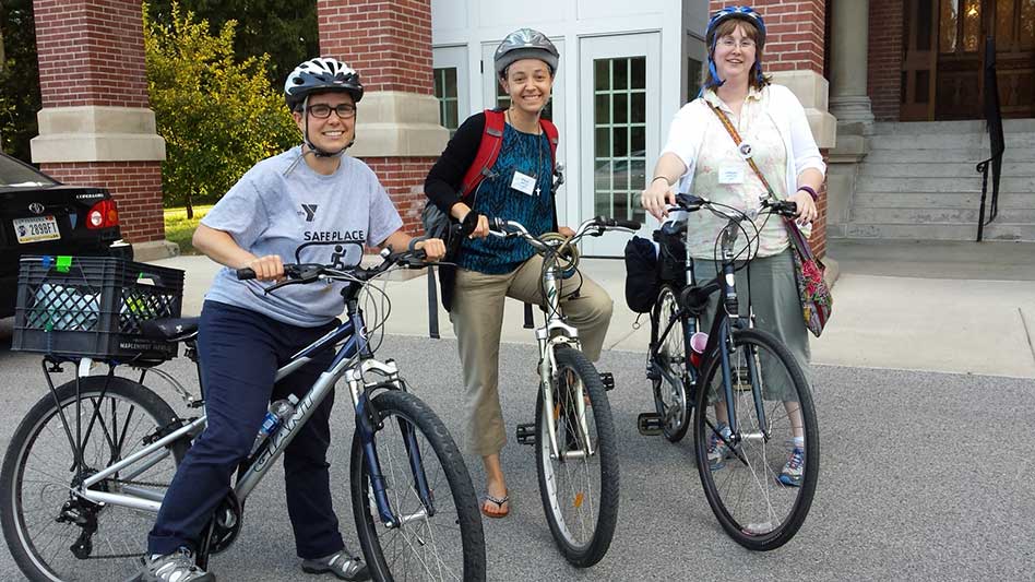 Sisters in initial formation, from left, Sisters Hannah Corbin, Tracey Horan and Arrianne Whittaker, take a bike ride in the evening after a long day at chapter. (photo by Sister Editha Ben)