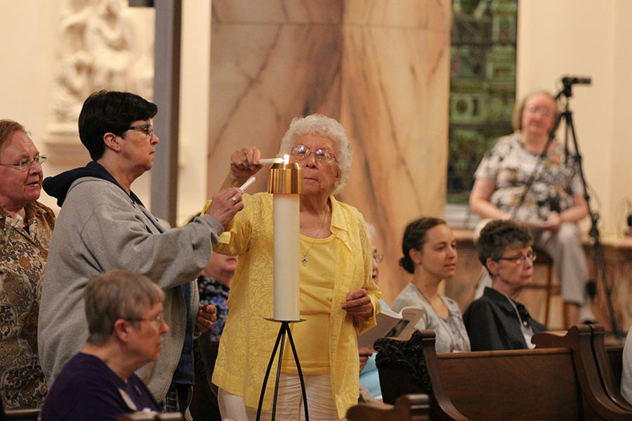 Sister Dawn Tomaszewski lights her candle as a chapter delegate during the opening ritual. At the end of the chapter she would be elected the next general superior. (photo by Amy Miranda)