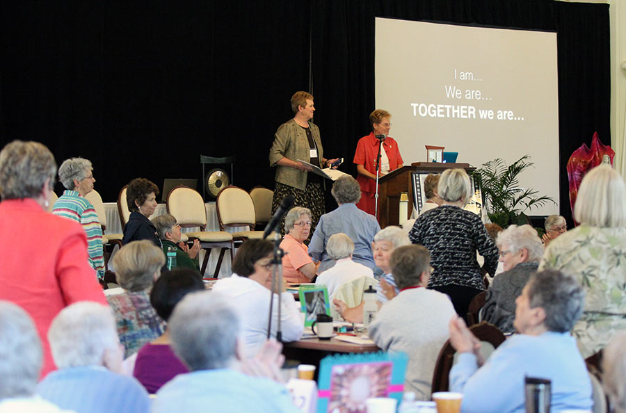 Newly re-elected General Officer Sister Jenny Howard is greeted by Sister Rita Ann Wade. (photo by Sister Joni Luna)