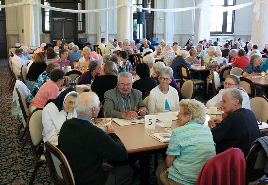 Providence Associates greet sisters and associates as they arrive at an evening meal social time for sisters and associates. Here Sister Mary Maxine Teipen speaks with Providence Associates. (photo by Amy Miranda)
