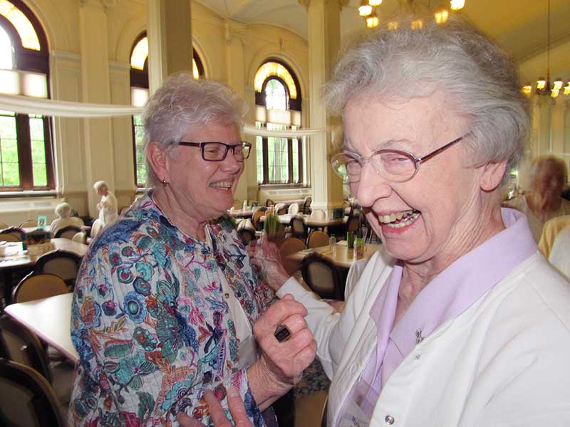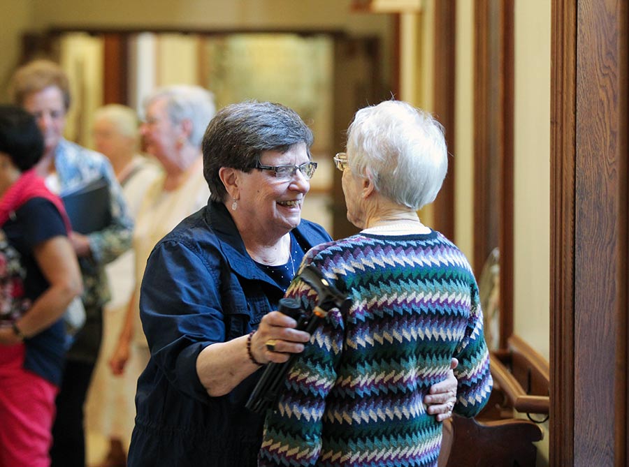 Sister Janice Ostrowski excitedly greets a sister she has not seen in a while. (photo by Amy Miranda)