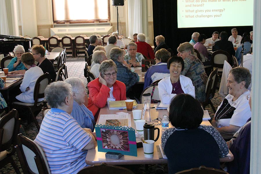 Sister Janice Smith (left) and Sister Patty Fillenwarth during table discussion time. (photo by Amy Miranda)