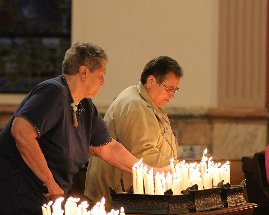 Sisters Carole Kimes and Mary Frances Keusal light their candles as chapter delegates during the opening ritual. (photo by Amy Miranda)