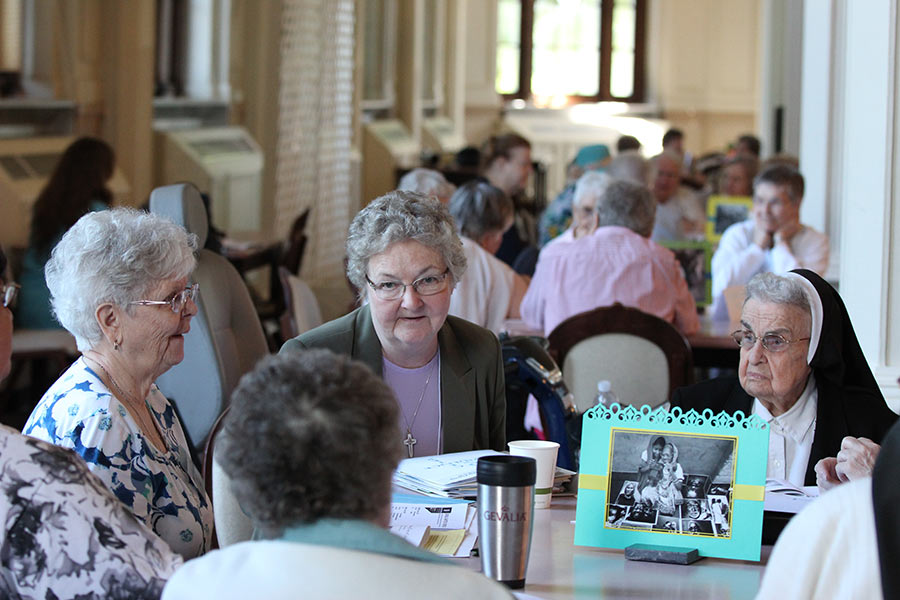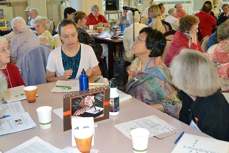 From left Sisters Mary Kay Duffy, Therese Guerin Sullivan and Helen Therese Conway engage in table discussion. (photo by Amy Miranda)