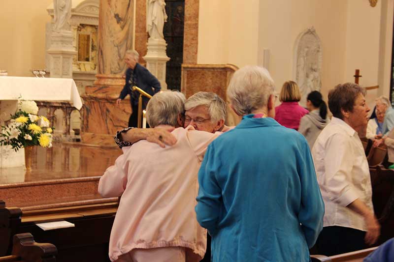 Sister Denise Wilkinson hugs Sister Rita Clare Gerardot during the sign of peace at the concluding Mass. (photo by Jason Moon)