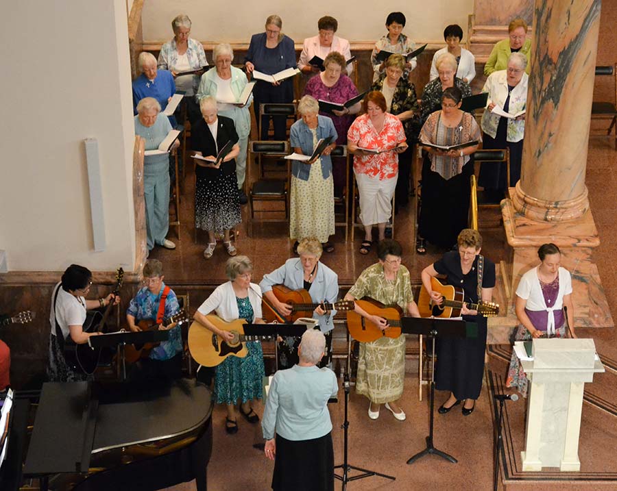 Providence Associate Michelle Davis, in orange, joins the Sisters of Providence musicians during the celebratory Liturgies.