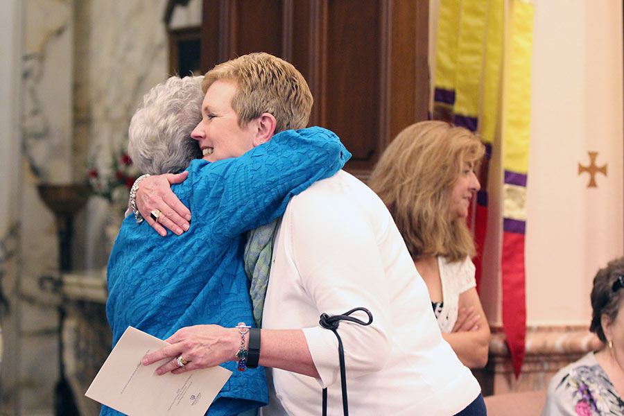 Providence Associate Debbie Dillow congratulates 50-year jubilarian Sister Linda Thompson before the Golden Jubilee Mass on Saturday.