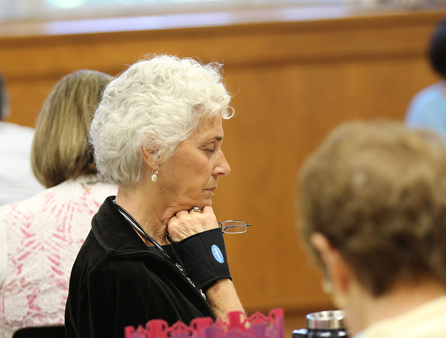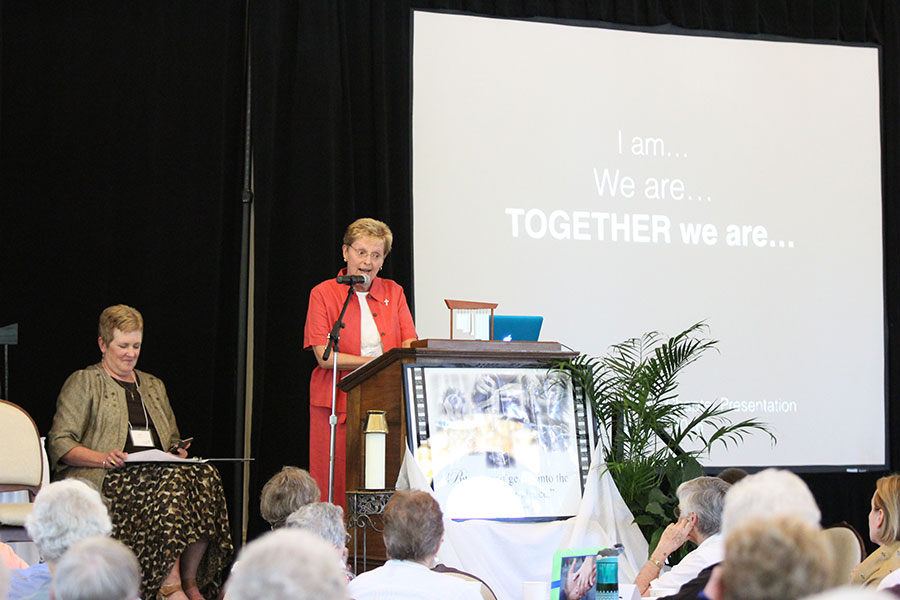 Front from left Sister Carolyn Bouchard and Providence Associate Kim Knoblock with Sister Marsha Speth at the podium during a prayer time on the first day of Chapter.
