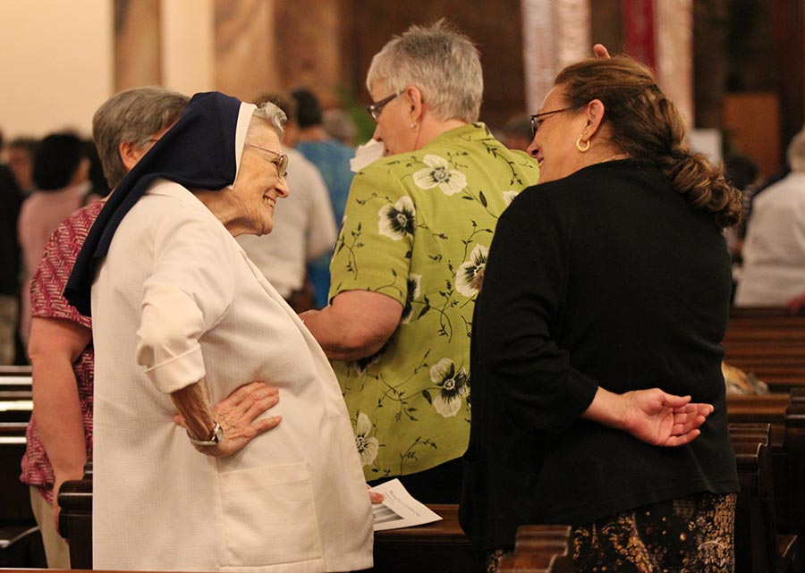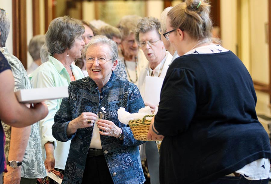 Sister Marian Brady, left , greets Providence Associate Teresa Clark before the opening ceremony for General Chapter.