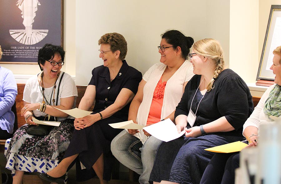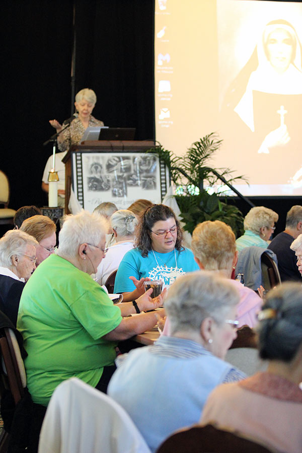 Providence Associate Marsha McCarty joins a table discussion with Sisters of Providence and other associates on the first day of the General Chapter.