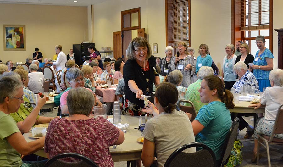 Providence Associate Lorrie Scheidler hands out “unite-mints” favors to Sisters of Providence and Providence Associates at the Sunday evening social dinner.