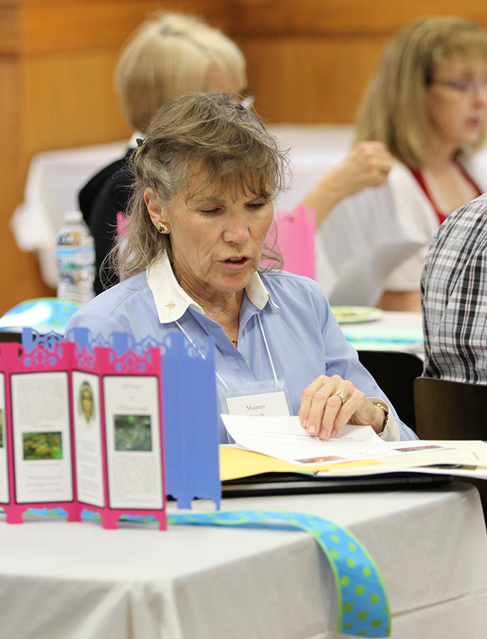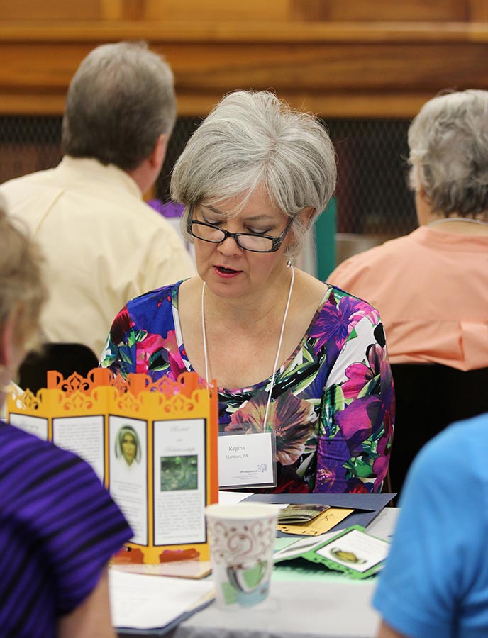 Providence Associate Sheila Donis, back center, near behind some of the beautiful table decorations she hand crafted for the meeting.