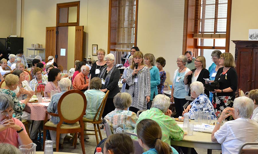 Providence Associate Regina Hartman joins in singing a song during a prayer time to open the meeting.