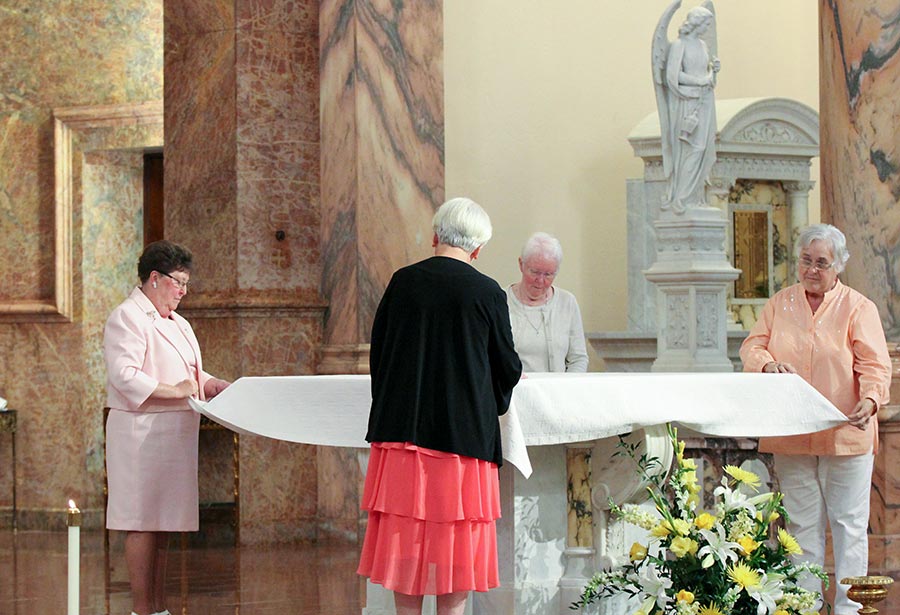 Providence Associate Sheila Donis, right, along with, from left, Sisters Mary Ann Stewart and Joan Slobig, prepare the altar cloth during the Jubilee Mass celebration.