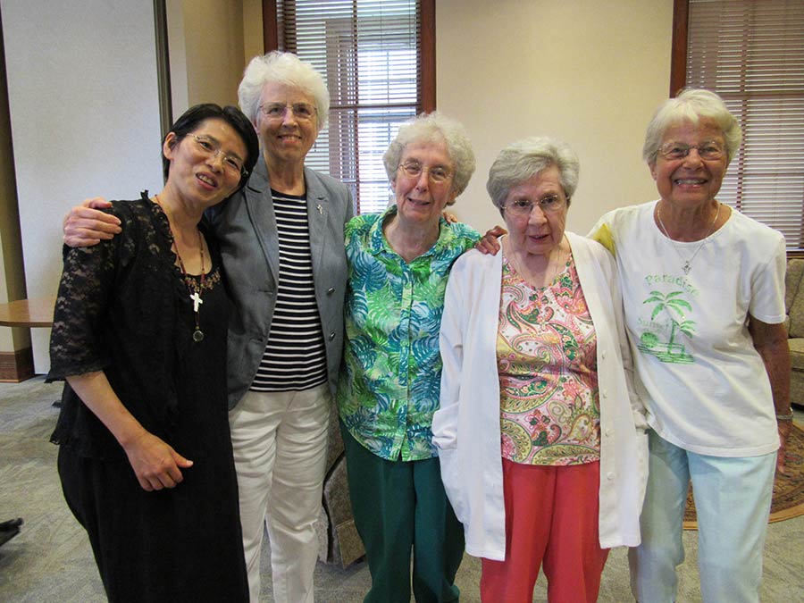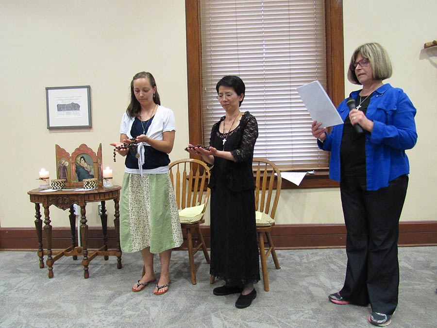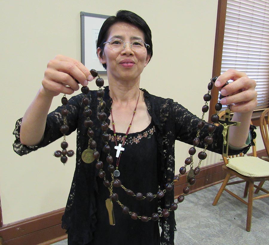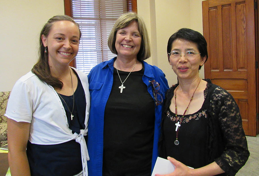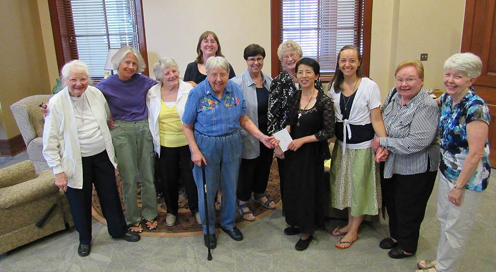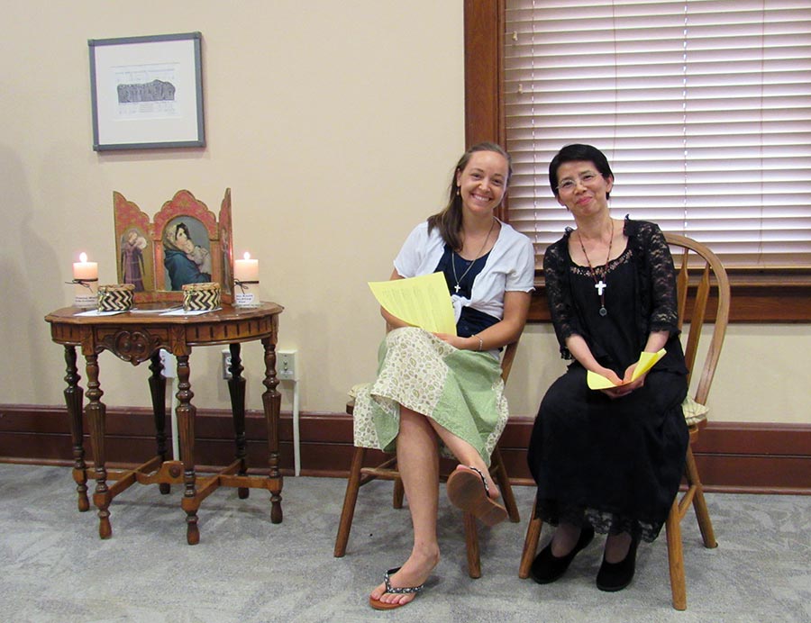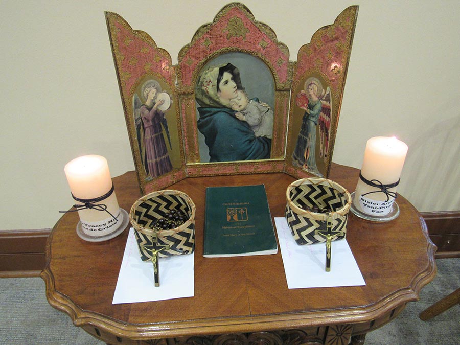 A blessing ceremony July 30, 2016, marked the transition for Sisters Tracey Horan and Anna Fan from their canonical novice year to their mission novice year, their third year with the Congregation. Local sisters gathered to bless them going forward and pray with them. Each novice sister received a historic Sisters of Providence chaplet. When sisters wore the traditional habit, receiving the chaplet signified moving forward in the formation process. Each novice sister today receives a chaplet passed down from an elder Sister of Providence.
