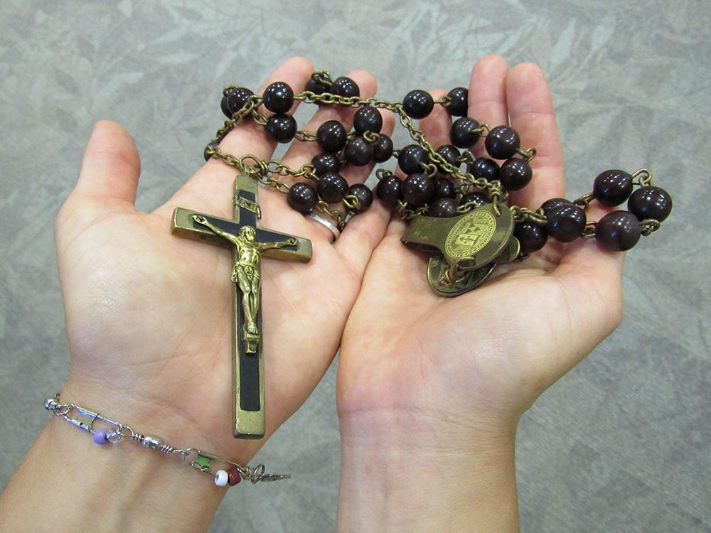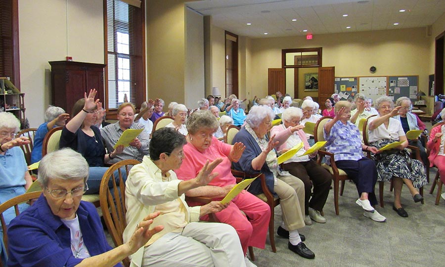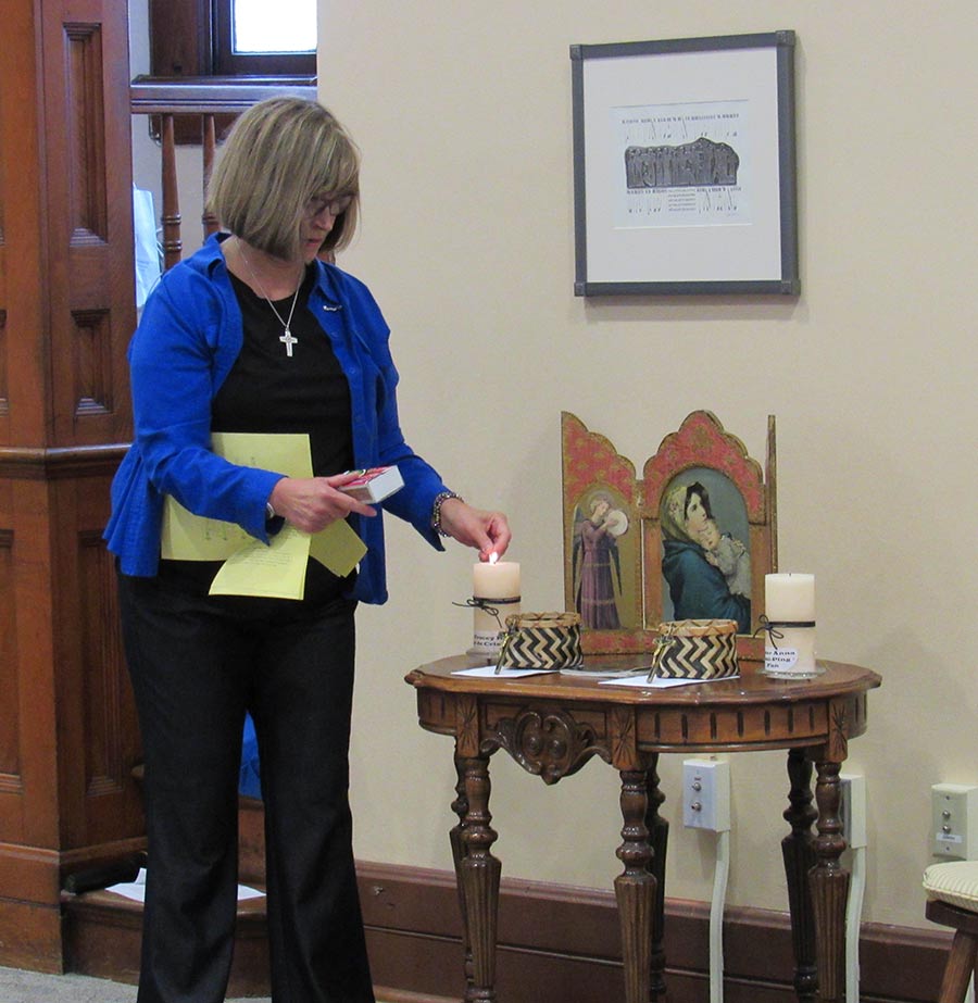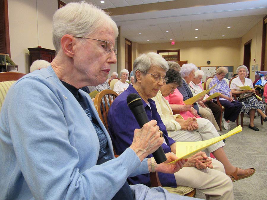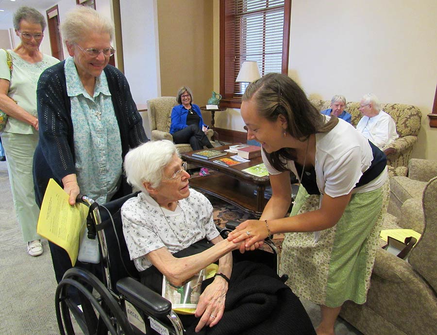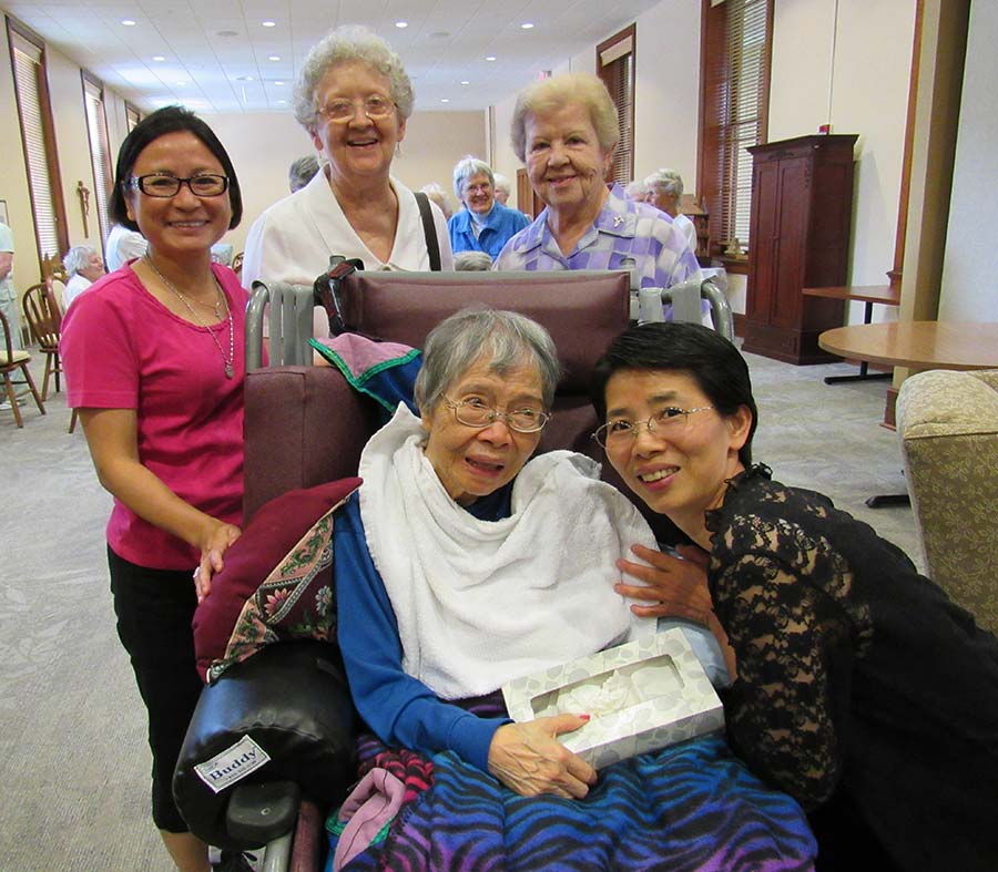 A blessing ceremony July 30, 2016, marked the transition for Sisters Tracey Horan and Anna Fan from their canonical novice year to their mission novice year, their third year with the Congregation. Local sisters gathered to bless them going forward and pray with them. Each novice sister received a historic Sisters of Providence chaplet. When sisters wore the traditional habit, receiving the chaplet signified moving forward in the formation process. Each novice sister today receives a chaplet passed down from an elder Sister of Providence.