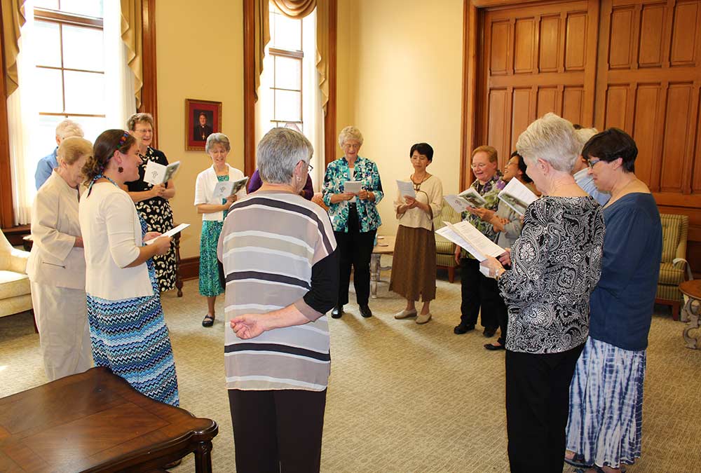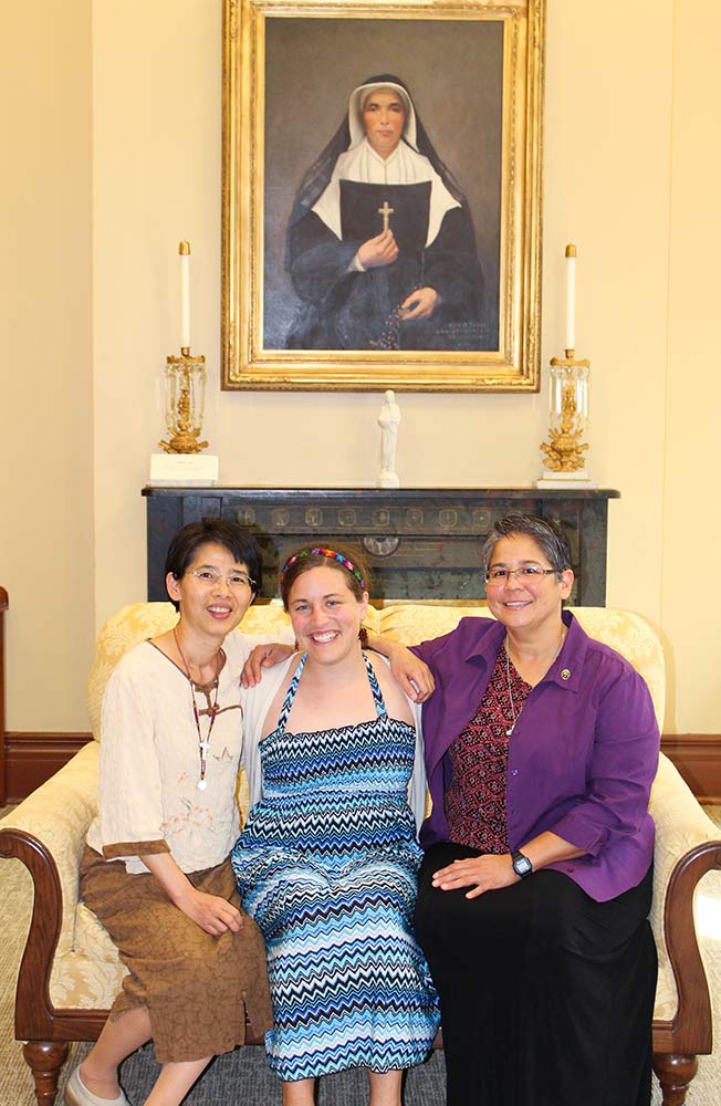 The whole group poses with Emily after the knocking ritual. Front row from left, Sister Anna Fan, Emily TeKolste, Sister Joni Luna. Second row from left, Sisters Nancy Nolan, Marsha Speth, Nancy Bartasavich, Denise Wilkinson, Mary Beth Klingel, Editha Ben. Back row from left, Sister Carole Kimes, Janice Smith, Jenny Howard, Dawn Tomaszewski, Jeanne Hagelskamp and Lisa Stallings.