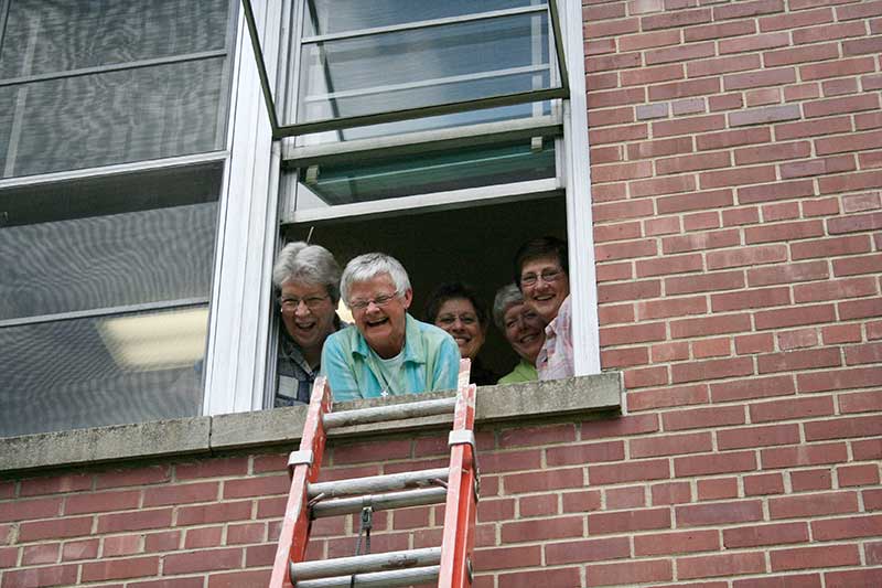 Sister Denise Wilkinson (front) with Sister Nancy Reynolds (back, from left) Sister Paula Damiano, Sister Marsha Speth and Sister Jane Marie Osterholt (RIP) in a photo from 2011 when the General Council got locked in a room inside Owens Hall.