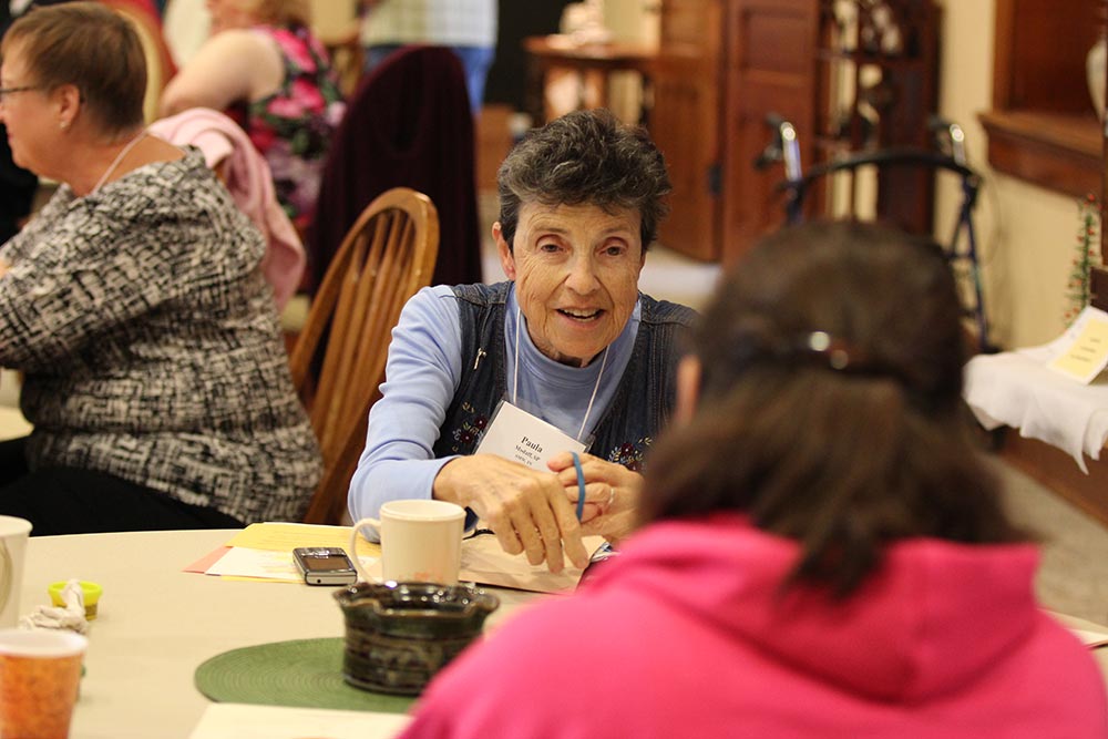 Sisters of Providence companion Sister Terri Boland, center, chats with those at her table during the orientation.